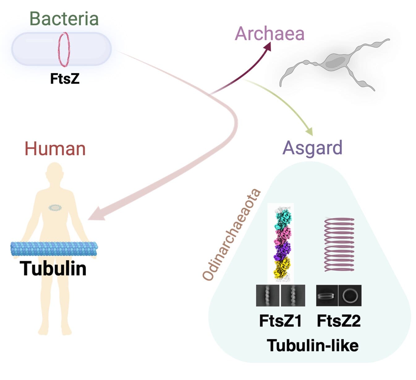 OdinFtsZ1 formed curved single filaments resembling those used by bacteria during cell division, while OdinFtsZ2 assembled into stacked spiral rings that looked like primitive microtubule-like structures. In other words, these proteins seemed to represent two different evolutionary experiments: one retaining an ancient bacterial form, and the other hinting at the beginnings of the more sophisticated tubules found in complex cells.