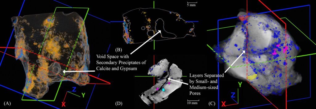 Some slag pieces from Tepe Hissar had previously shown signs of copper; others contained none at all. The CT images clarified that intact copper-bearing droplets existed in some samples, confirming their connection to copper production. The scans also revealed the winding channels where gases once escaped, leaving behind voids that preserve clues about the temperature, chemistry, and timing of ancient smelting events.