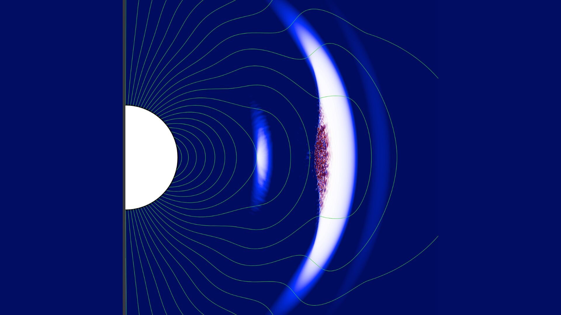 Until now, monster shocks had only been studied in simplified settings, usually assuming straight magnetic fields and idealized geometry. Real magnetars are messier. Their magnetic fields curve and twist into a dipolar magnetosphere, more like a bar magnet than a straight line.