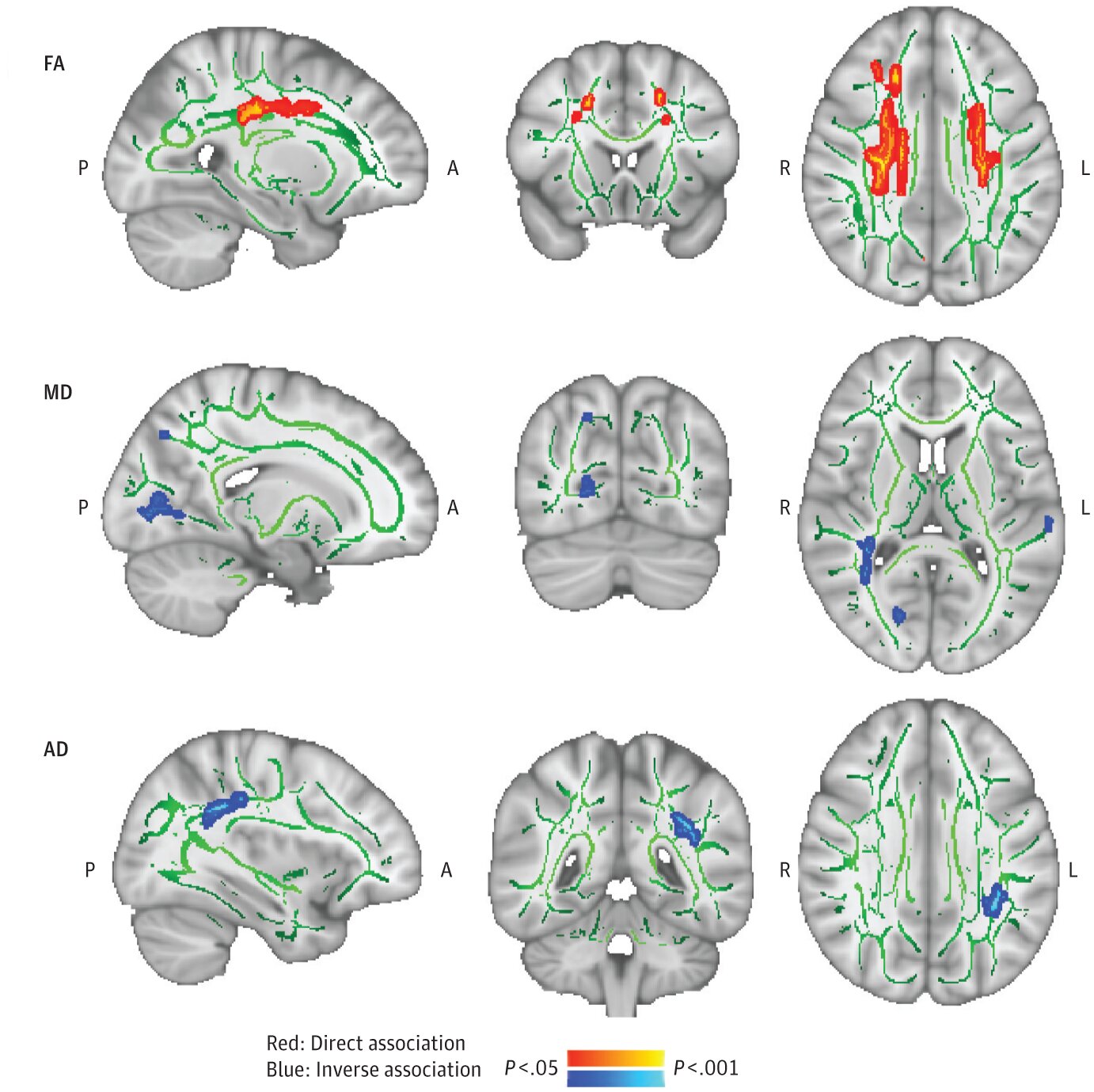 - Better white matter integrity, reflected in higher fractional anisotropy and lower mean diffusivity, suggested healthier, more robust brain wiring.