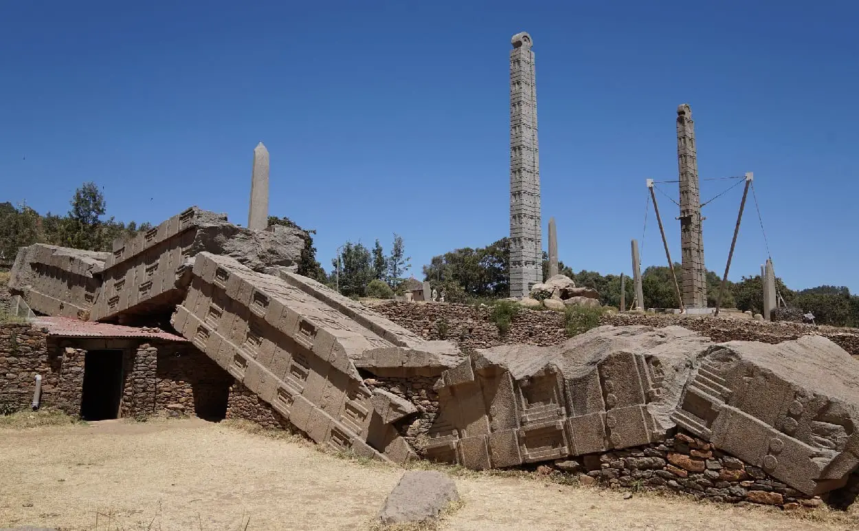 Even centuries after its decline, Aksum remains famous for its monumental architecture. The most striking symbols of its glory are the stelae—towering obelisks carved from single pieces of granite. Some reached heights of over 30 meters, intricately decorated with false doors, windows, and symbolic motifs. These stelae were not mere markers but sacred monuments, often associated with royal tombs.