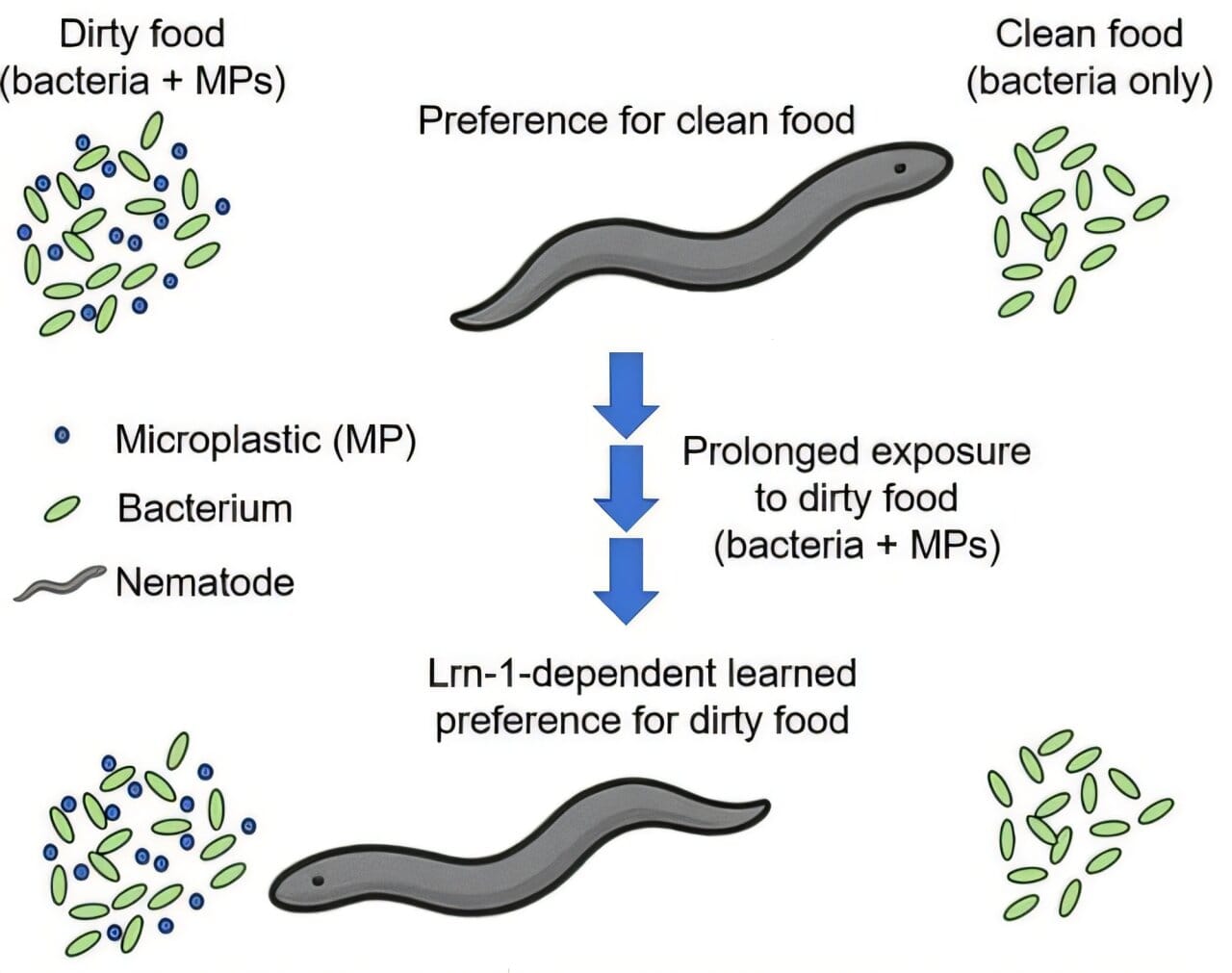 But smell alone wasn’t enough. A second group of mutants, deficient in a gene called lrn-1, couldn’t perform associative learning. These worms could smell the difference between food types but didn’t change their preferences over time. Even after generations of exposure to microplastic-laced food, they continued to avoid it.
