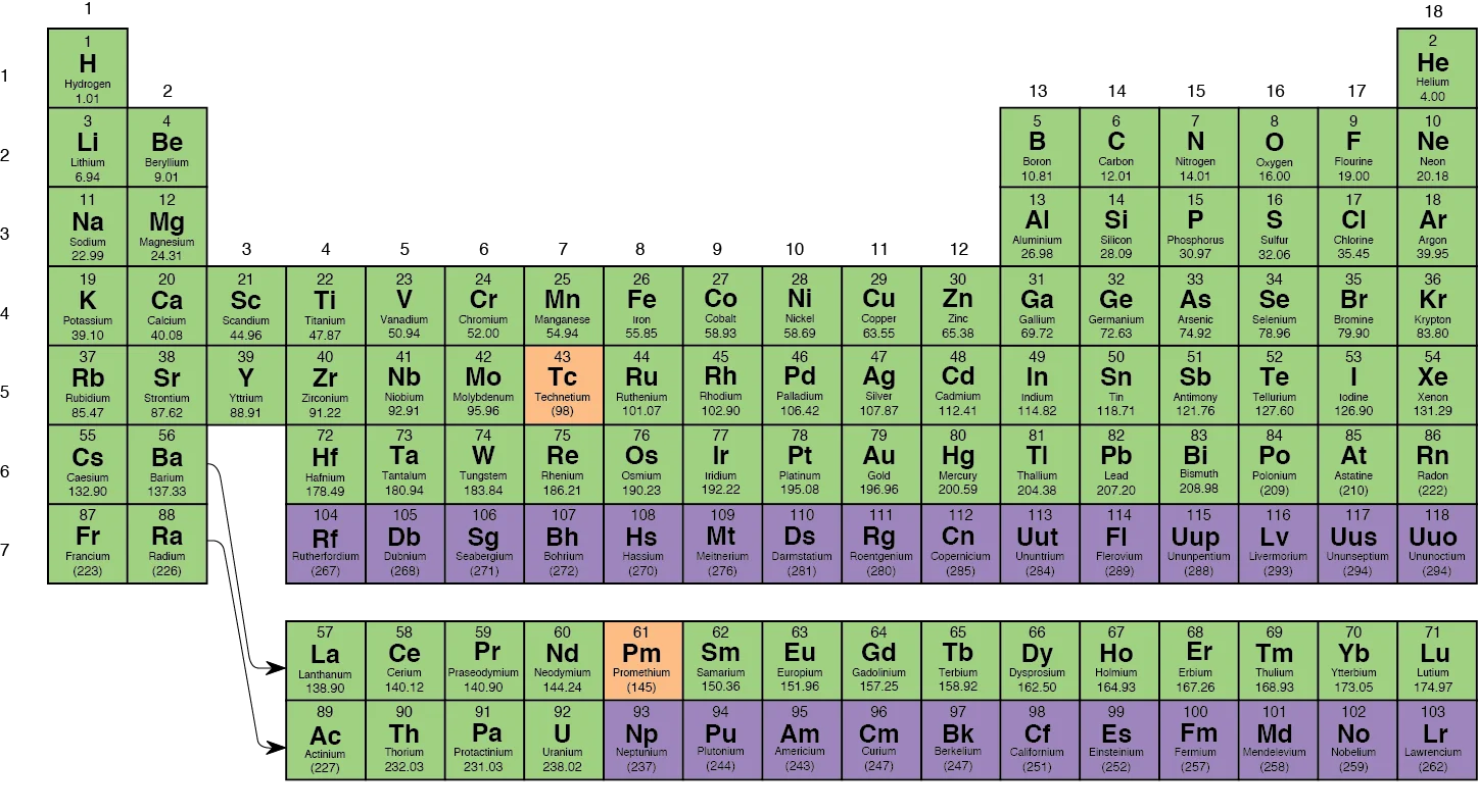 At the outer reaches, oganesson (118) sits as the current heaviest confirmed element, though it behaves more like a strange gas or plasma than a simple heavy noble gas.