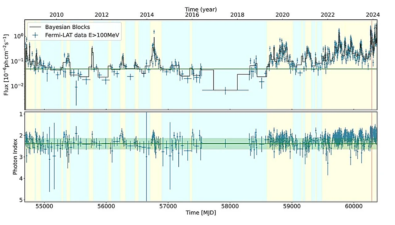 The researchers were particularly interested in the blazar’s so-called quiescent phase. If the recent flares were the climax of a longer process, the clues might be hidden in subtle trends that unfolded slowly over time. As Bartolini’s team explained, OP 313 showed persistent high-state activity starting in 2022, following more than a decade of relative calm. That made the long view essential.